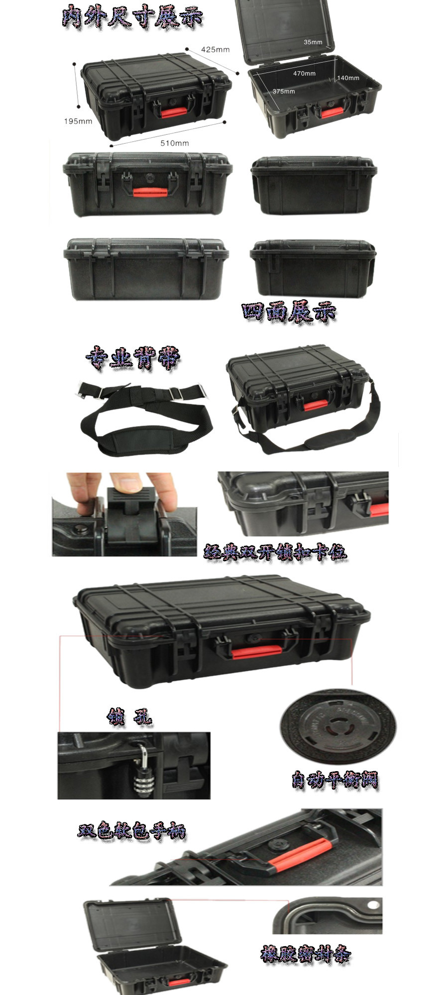 簡要說明:廣泛用于傳媒、公安、消防、軍隊、航空、戶外攝影、野外考察、科學探測等眾多領(lǐng)域的高端儀器、儀表。具有高強度、高抗壓沖擊、防潮、絕對密封、防塵、防水等特點。產(chǎn)品材質(zhì):ABS原料,箱體采用高抗沖擊的高分子聚合材料一體注塑成型,密封采用扁型彈性發(fā)泡密封橡膠條,確保防水氣密,所有較軸均采用不銹鋼材質(zhì)。