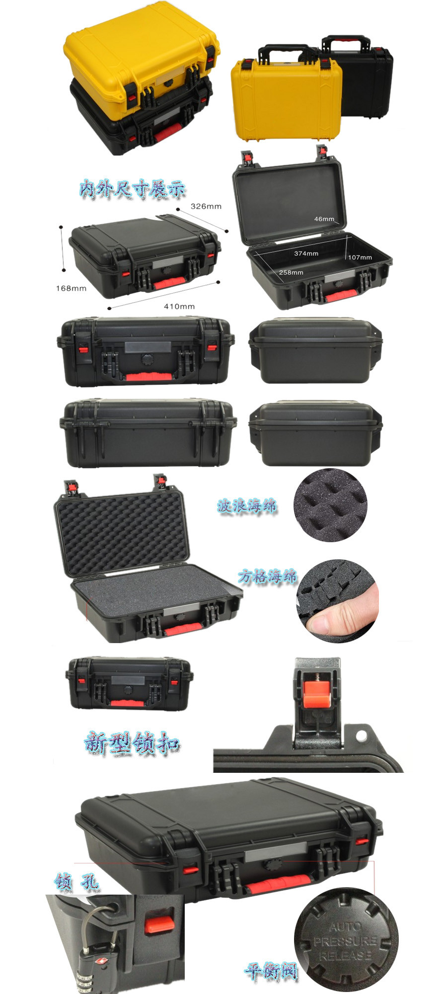 簡要說明:廣泛用于傳媒、公安、消防、軍隊(duì)、航空、戶外攝影、野外考察、科學(xué)探測等眾多領(lǐng)域的高端儀器、儀表。具有高強(qiáng)度、高抗壓沖擊、防潮、絕對(duì)密封、防塵、防水等特點(diǎn)。產(chǎn)品材質(zhì):ABS原料,箱體采用高抗沖擊的高分子聚合材料一體注塑成型,密封采用扁型彈性發(fā)泡密封橡膠條,確保防水氣密,所有較軸均采用不銹鋼材質(zhì)。