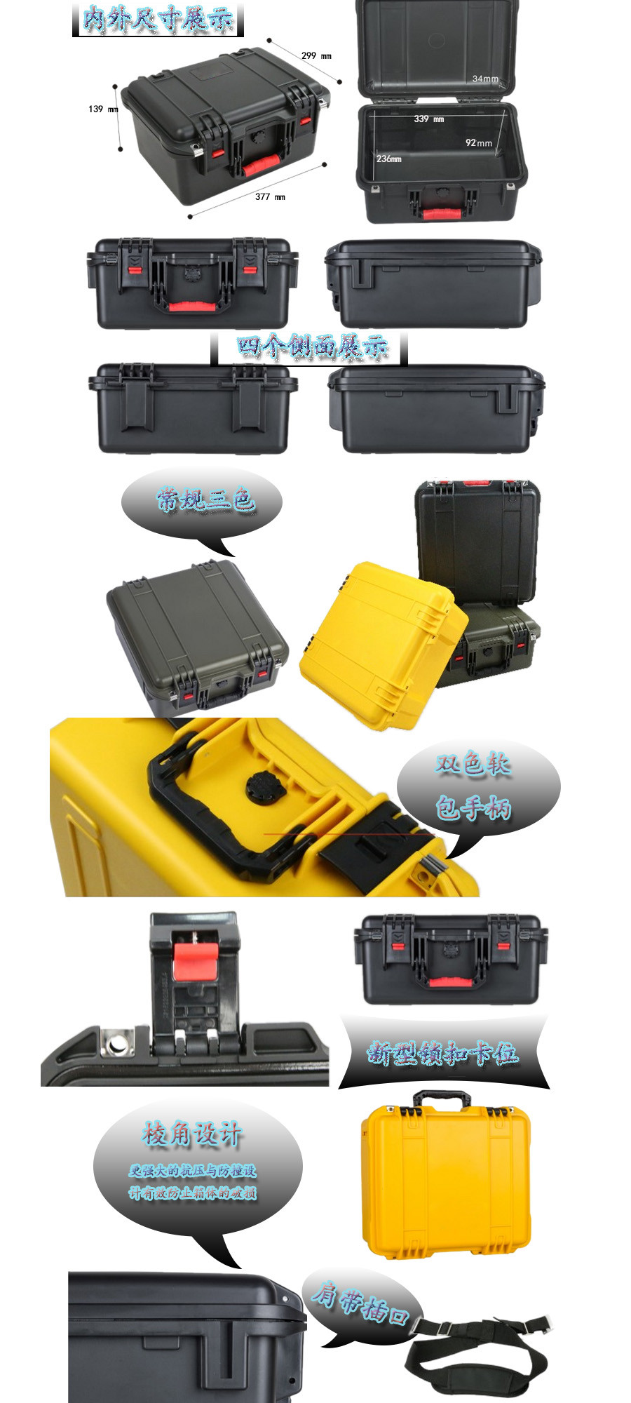 簡(jiǎn)要說(shuō)明:廣泛用于傳媒、公安、消防、軍隊(duì)、航空、戶外攝影、野外考察、科學(xué)探測(cè)等眾多領(lǐng)域的高端儀器、儀表。具有高強(qiáng)度、高抗壓沖擊、防潮、絕對(duì)密封、防塵、防水等特點(diǎn)。產(chǎn)品材質(zhì):ABS原料,箱體采用高抗沖擊的高分子聚合材料一體注塑成型,密封采用扁型彈性發(fā)泡密封橡膠條,確保防水氣密,所有較軸均采用不銹鋼材質(zhì)。