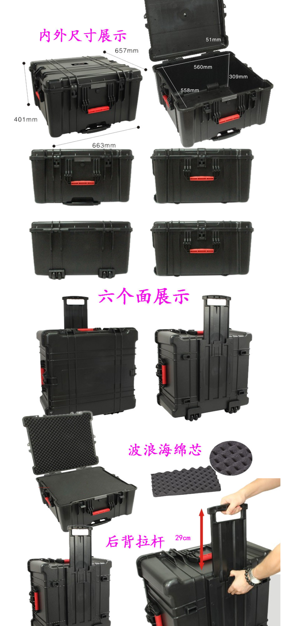 簡要說明:廣泛用于傳媒、公安、消防、軍隊、航空、戶外攝影、野外考察、科學(xué)探測等眾多領(lǐng)域的高端儀器、儀表。具有高強度、高抗壓沖擊、防潮、絕對密封、防塵、防水等特點。產(chǎn)品材質(zhì):ABS原料,箱體采用高抗沖擊的高分子聚合材料一體注塑成型,密封采用扁型彈性發(fā)泡密封橡膠條,確保防水氣密,所有較軸均采用不銹鋼材質(zhì)。